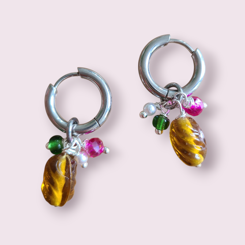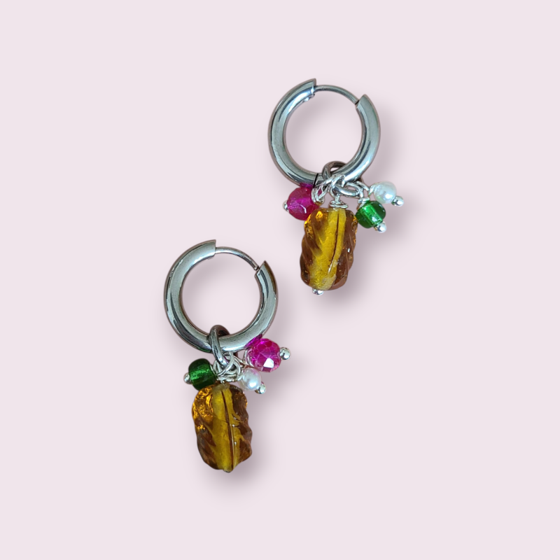 Oorbellen gemaakt van roestvrijstaal in zilver kleur. een hanger met bruine roze en groene kralen.