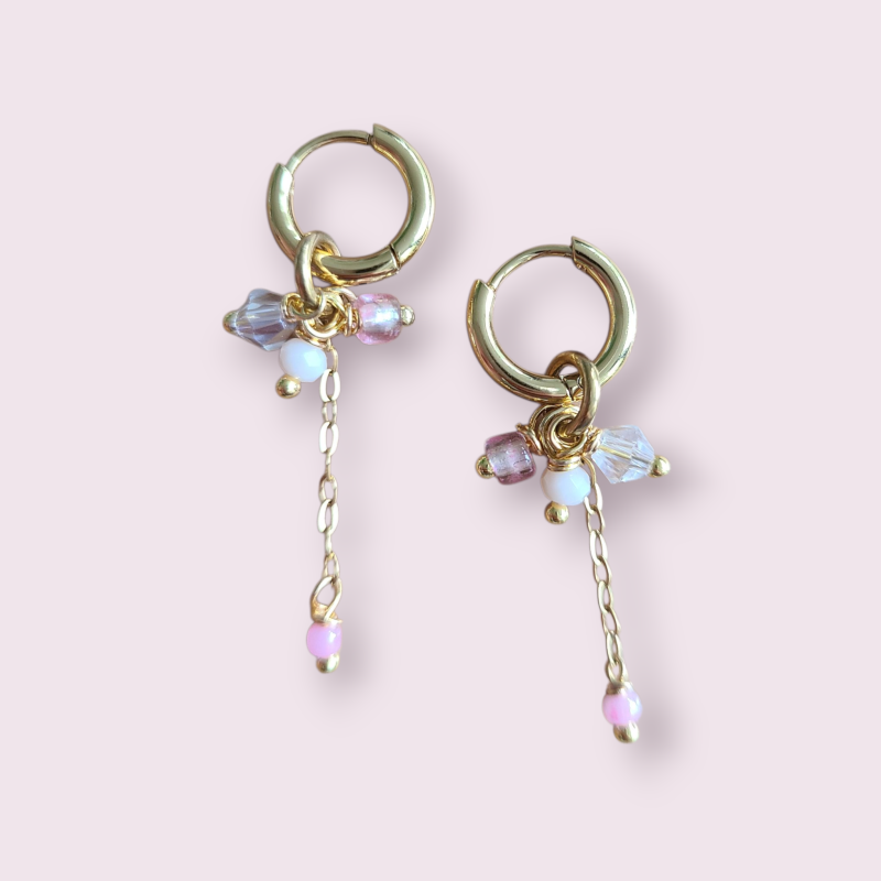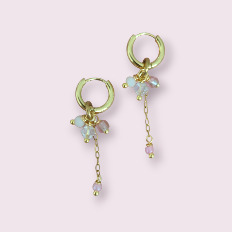 Roestvrijstalen oorbellen in goudkleur met roze kralen hanger